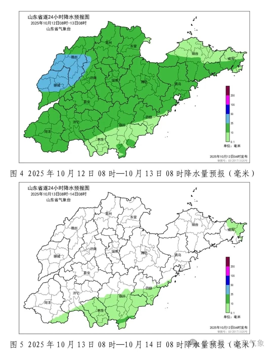 10 月 11 日 06 时至 12 日 06 时,全省大部地区出现降水,平均降水量 8.0(毫米,下同),折合水量约 12.6 亿方(图 1)。各市平均:德州 16.2、淄博 15.4、东营14.4、济南 14.4、滨州 14.0、聊城 12.4、烟台 12.2、潍坊 9.9、威海 7.9、青岛 6.1 和泰安 1.6,其他市降水量不足 1.0。县(市、区)平均降水量超过 25.0的 4 个,10.0—25.0 的 43个,5.0—10.0的 16 个,前 3位的是:德州夏津 32.6、聊城临清28.8和德州平原28.3。所有站点超过25.0的99个站,10.0—25.0 的659 个,5.0—10.0的 289个,降水量前 3位的是:德州夏津王庄闸 46.0(水文站) 、德州夏津 46.0(水文站)和德州渤海路小学 42.2。今年以来全省平均降水量808.0,较常年同期偏多 191.7(31%)。 6 月以来全省平均降水量 702.9,较常年同期偏多 209.3(42%)。9 月以来全省平均降水量 296.1,较常年同期偏多 222.4(301.5%)。