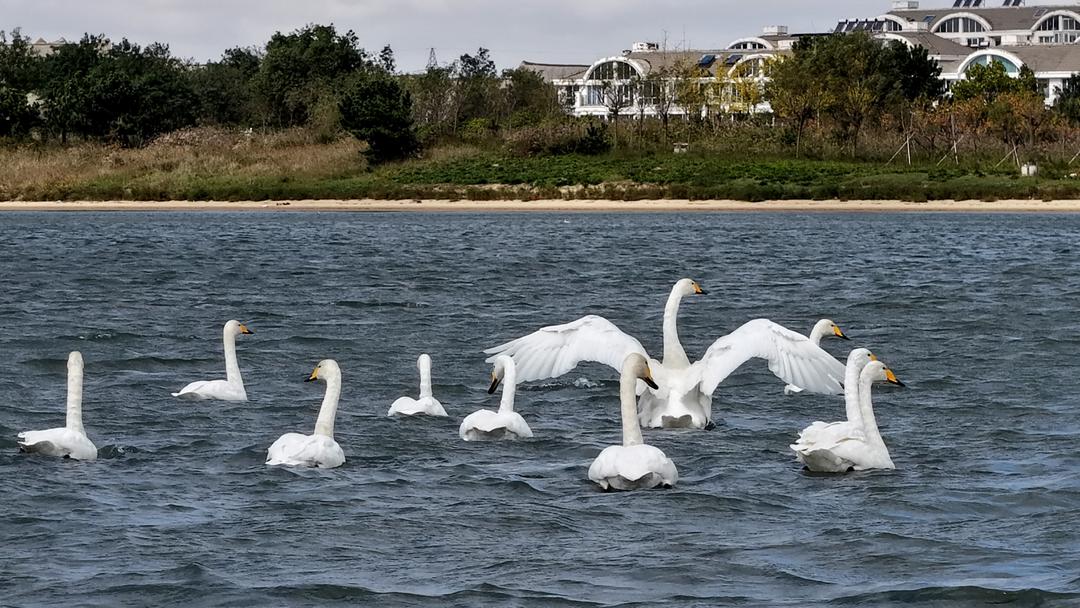 10月18日,在荣成市大天鹅国家级自然保护区,首批19只越冬大天鹅飞抵天鹅湖。良好的生态环境、广阔的水域以及丰富的食物资源,使这里成为大天鹅理想的“越冬胜地”。(大众新闻记者 陶相银 通讯员 杨志礼 报道)