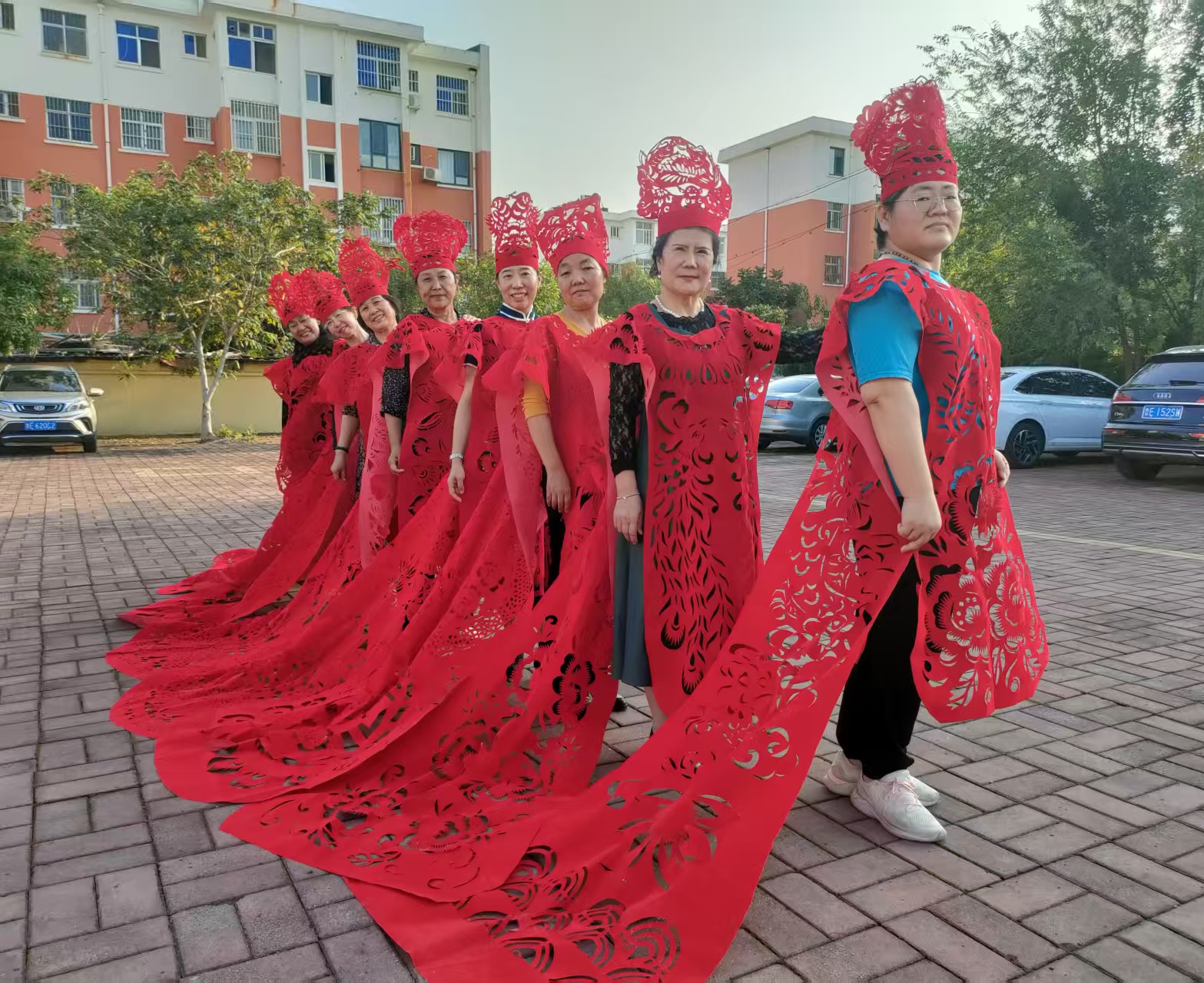 学员们戴上红得发亮的剪纸冠帽,手抚着红色剪纸披风上的“龙凤呈祥”花纹,她们脸上的喜悦与成就感如同春日里绽放的花朵,瞬间在心底肆意盛开。大家并肩而站,身后拖曳的披风,宛如燃烧的红毯,热烈而夺目。衣角上那一个个灵动的“福”字,随着学员们的步伐轻轻摇曳,恰似从纸间欢快跃出的精灵。眼前呈现出“眸光流转藏星辰,浅笑嫣然生春桃;行走若凤拂长柳,静立如兰沁幽香。”的画面,大家喜上眉梢,醉在心间。
