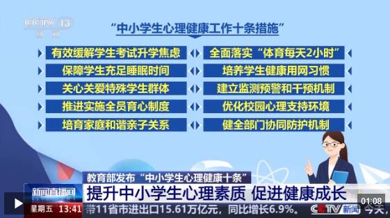针对中小学生心理健康阶段性特点和突出问题,近日,教育部印发通知,出台《进一步加强中小学生心理健康工作十条措施》。