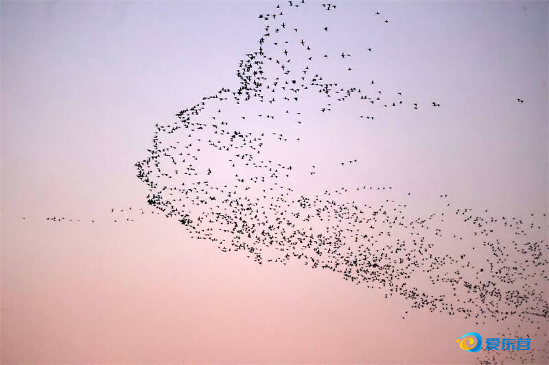 爱东营讯 深秋的傍晚,黄河口湿地上空数以万计的花脸鸭腾空而起,追逐翻腾的阵型如沙画般瞬息万变,掀起层层“鸟浪”。