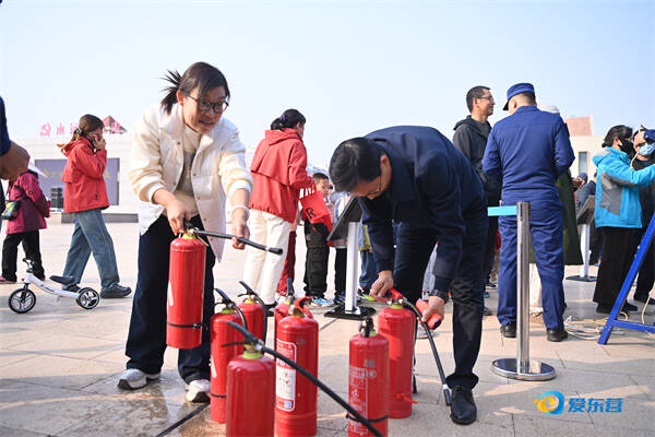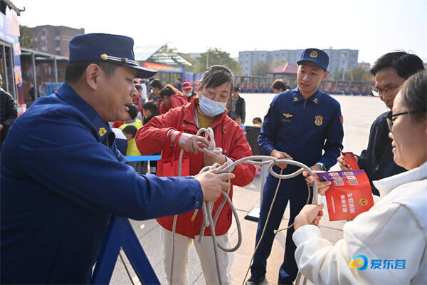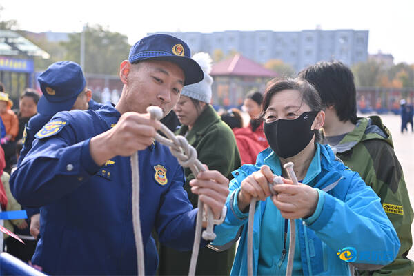 消防员与市民互动学习打消防绳结,传授实用的消防技能。