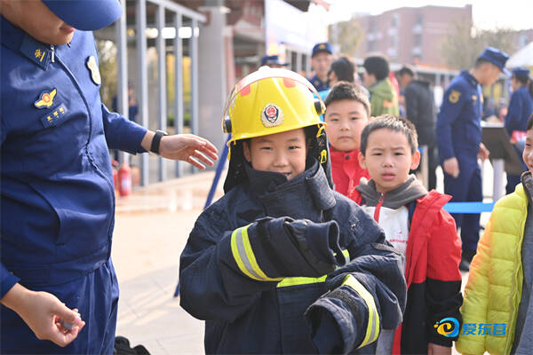 小朋友试穿消防服,体验消防员的工作装备,增强对消防职业的认知。