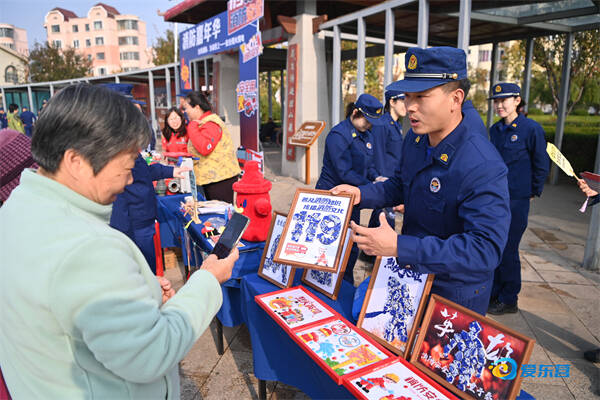 消防员在消防文创展台前,向市民介绍消防主题文创产品,传播消防文化。