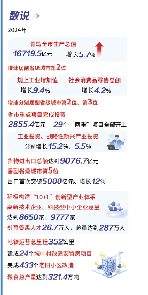 2024年,青岛全市生产总值达到16719.5亿元,增长5.7%;省市重点项目完成投资2855.4亿元,29个“两重”项目全部开工;工业投资、战略性新兴产业投资分别增长15.2%、5.5%;货物进出口总额达到9076.7亿元,出口首次突破5000亿元。胶东国际机场转场运营,港口货物、集装箱吞吐量稳居全球第4位、第5位,全球航运中心城市综合实力排名升至第13位……
