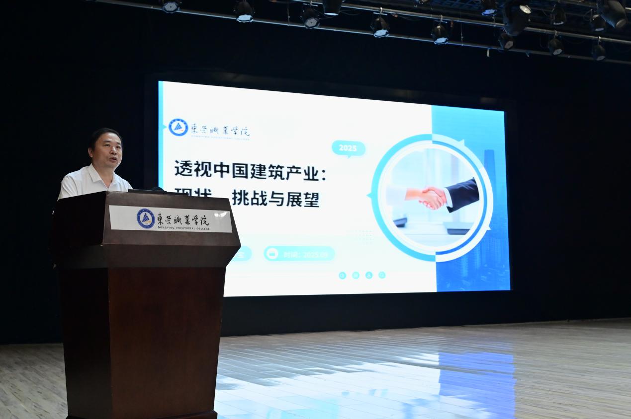 智能建造工程学院副院长张传宝以《透视中国建筑产业:现状、挑战与展望》为题作报告。他指出,建筑业正处于转型关键期,面临市场存量提质、数字化应用不足等挑战,并提出数字化转型、产业链整合、拓展绿色领域等破局路径,为新生职业生涯规划指明方向。
