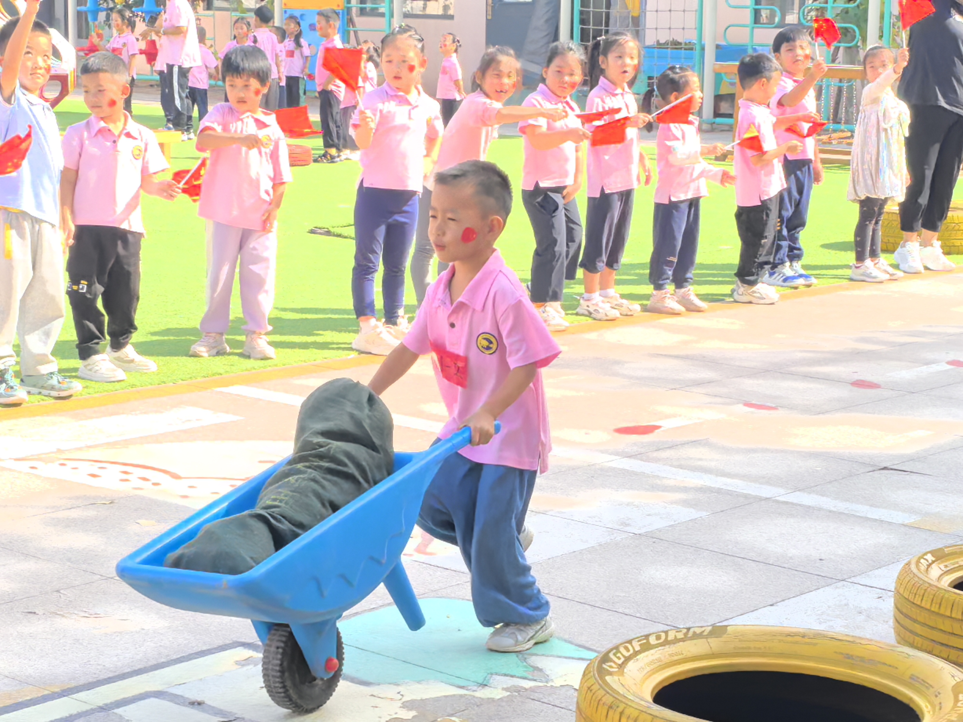 本次活动巧妙地将国庆节的爱国主题、中秋节团圆习俗与黄河文化内涵融入户外体育竞赛。操场化身为欢乐的赛场,孩子们在“黄河小骑手运石固堤”中体验协作与平衡,在“跨越黄河勇过桥”中展现勇气与敏捷,在“玉兔送月饼”中传递温情与祝福。每一个游戏环节都经过精心设计,不仅锻炼了幼儿的肢体协调能力和团队协作意识,更让他们在亲身体验中加深了对传统节日的认知和对母亲河黄河的情感。
