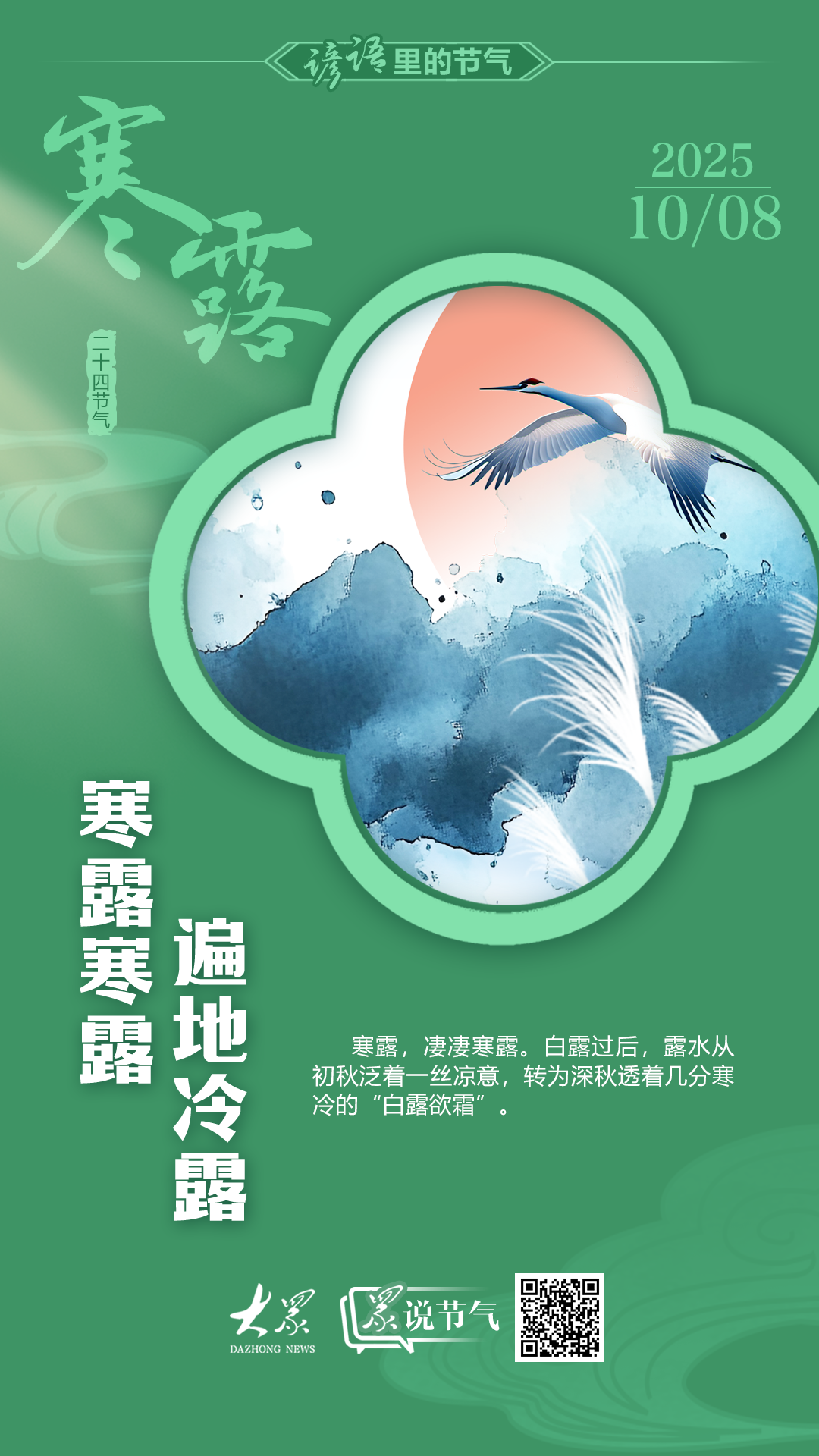 谚语说:“寒露寒露,遍地冷露。”二十四节气中,有两个节气是描述露水的,一个是白露,另一个是寒露。白露过后,露水从初秋泛着一丝凉意,转为深秋透着几分寒冷的“白露欲霜”。