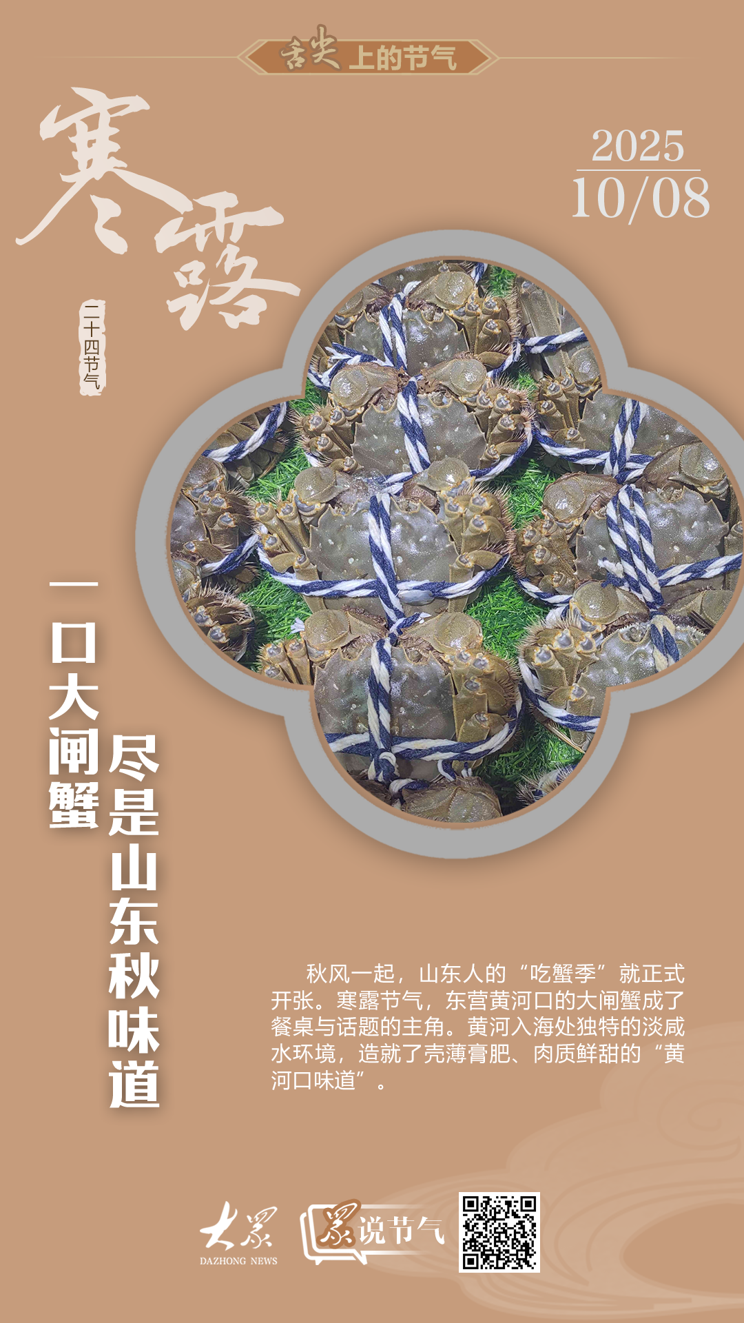 秋风一起,山东人的“吃蟹季”就正式开张。在寒露这个节气,东营黄河口的大闸蟹成了餐桌与话题的主角。黄河入海处独特的淡咸水环境,造就了壳薄膏肥、肉质鲜甜的“黄河口味道”,也让这里的大闸蟹从地方特产走向了区域品牌。