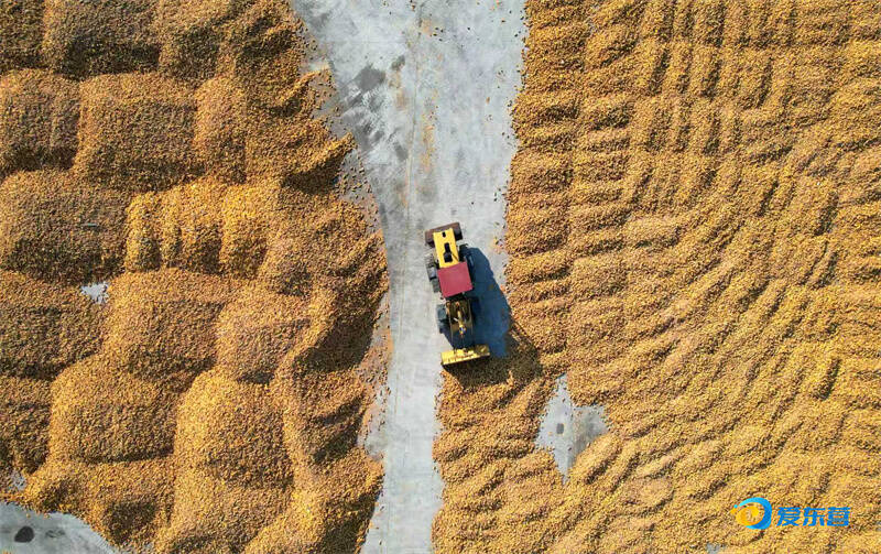 爱东营讯 近日,位于东营区牛庄镇的东营吕韵农业有限公司内,工人正在驾驶机械摊铺晾晒玉米。