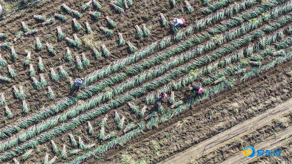 图为在广饶县李鹊镇苏家村的农田里,农民正在收获大葱。