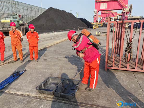 当天下午,码头作业人员模拟进入船舱清舱时,扒舱挖掘机翻动货物过程中意外产生硫化氢有毒有害气体,一名作业人员不慎“中毒窒息”昏迷。现场监护人员第一时间发现险情,没有丝毫迟疑,立即按下对讲机,向中控室紧急报告并请求救援,一场与时间赛跑的应急处置迅速展开。