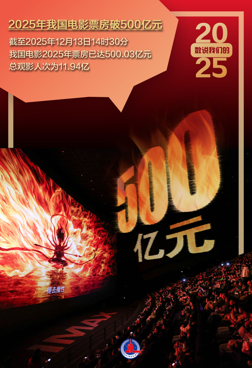 根据国家电影局统计,截至2025年12月13日14时30分,我国电影2025年票房已达500.03亿元,总观影人次为11.94亿。其中国产影片票房为409.52亿元,份额为81.90%。↓