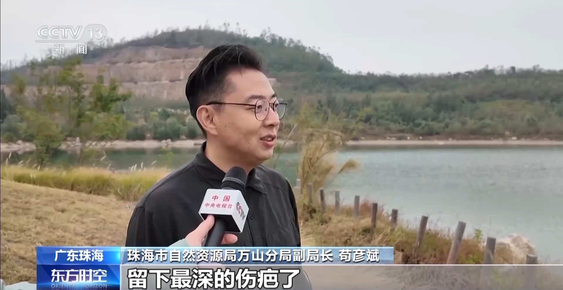 珠海市自然资源局万山分局副局长 苟彦斌:之前它是一个很深的矿山开采的矿坑,可以说是之前三角岛留下最深的伤疤了。但是现在把海水淡化成淡水,注入湖泊里面,已经形成了天然矿湖的形态。