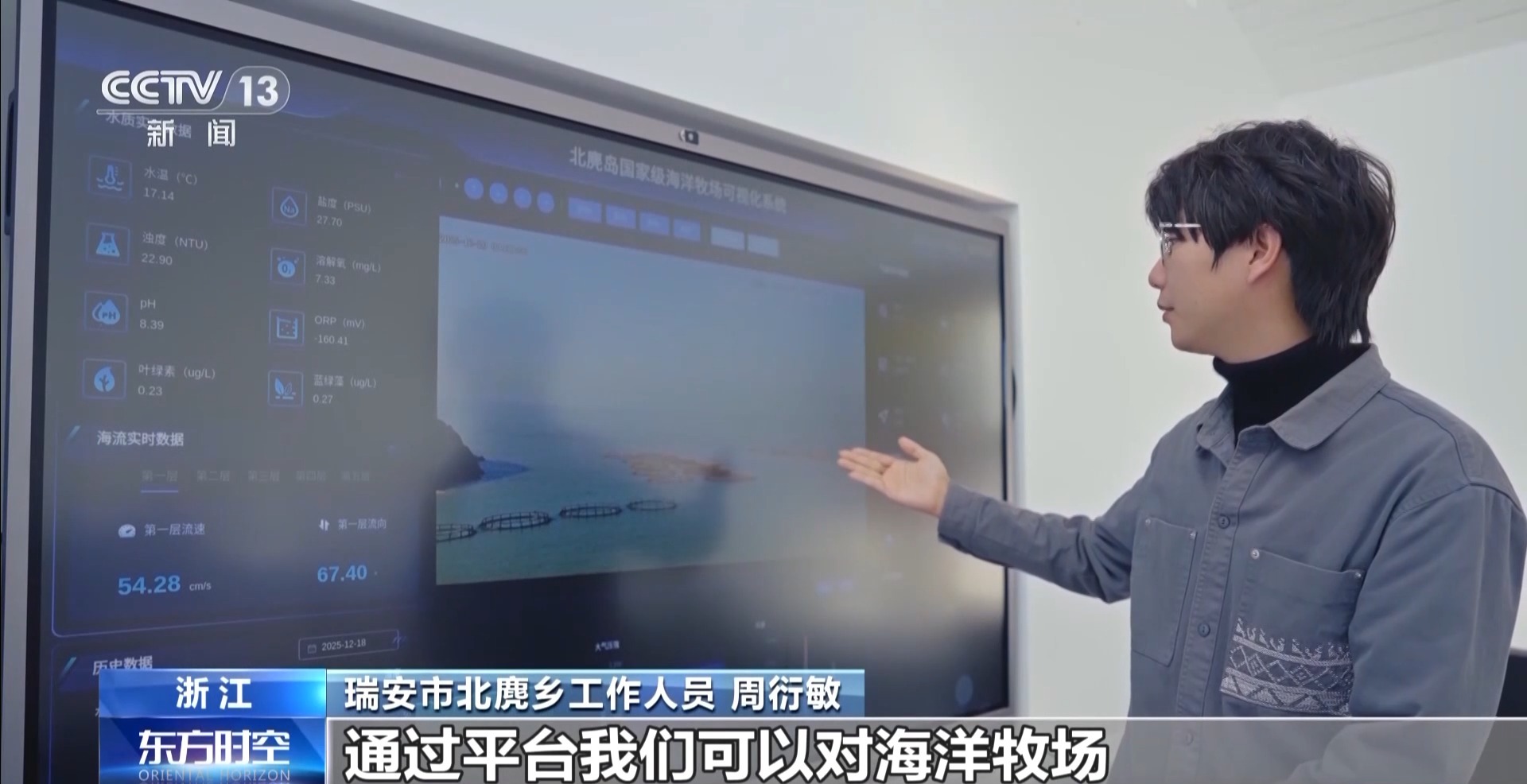 瑞安市北麂乡工作人员 周衍敏:通过平台,我们可以对海洋牧场所在海域的实时影像、水下影像、气象、水质进行全方位的监测,确保海洋生态养护效果。