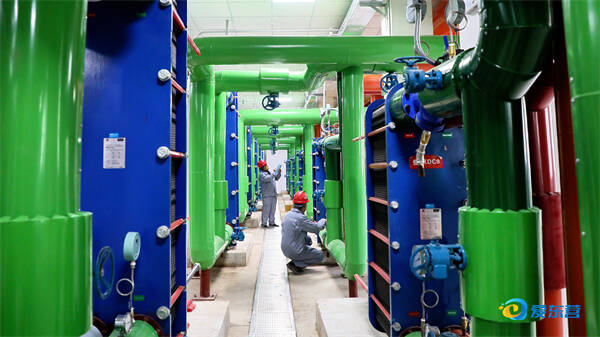 在东营经济技术开发区登州路地热能源站内,工作人员正在检查板式换热器运行情况。