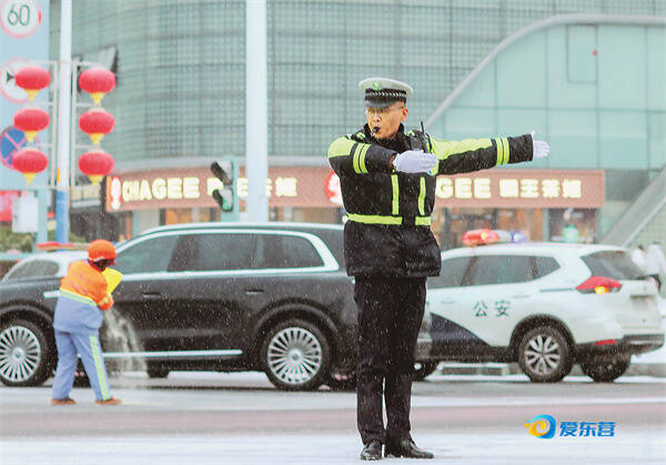 1月18日上午,东营市公安局交管支队东营区大队民警辅警在繁忙路段冒雪执勤,维护道路交通秩序。 通讯员 解朋龙 报道