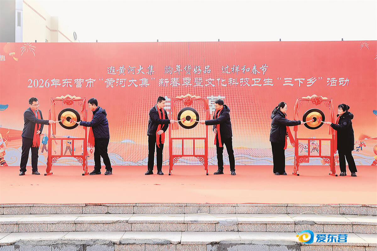 爱东营讯 2月4日上午,迎着立春的暖阳,伴着清脆的锣声,广饶县花官镇法治文化广场上人潮涌动、热闹非凡,2026年东营市“黄河大集”新春季暨文化科技卫生“三下乡”活动正式启动。