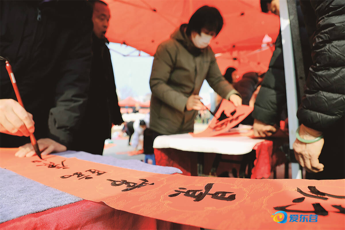 时近春节,涵盖年画、春联等民俗产品展位的“书香东营体验区”可谓是“人气王”。本地书画艺术家弯着腰,写春联、画年画、送福字。