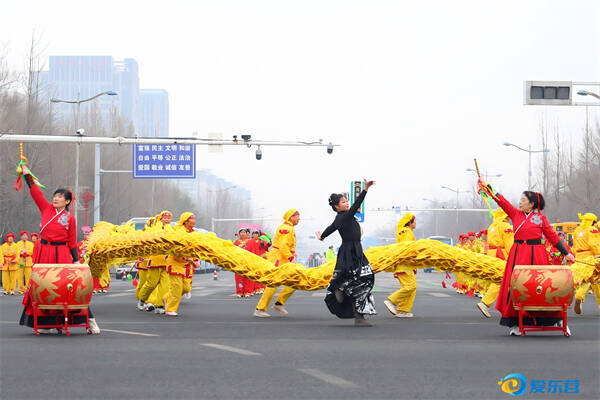 爱东营讯 2月26日,在广饶县城区乐安大街,来自大王镇的特色巡演队伍正在表演民俗节目。