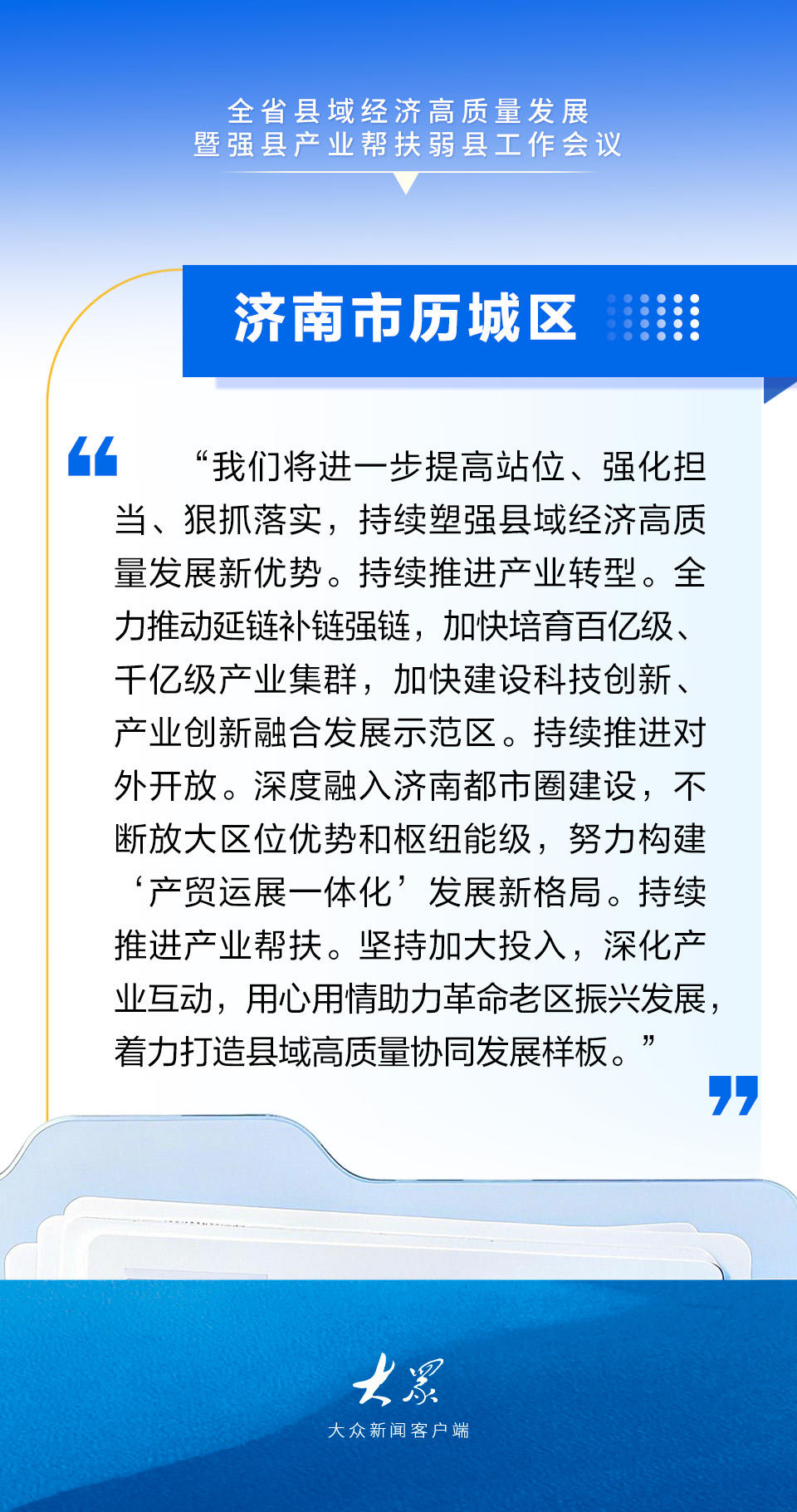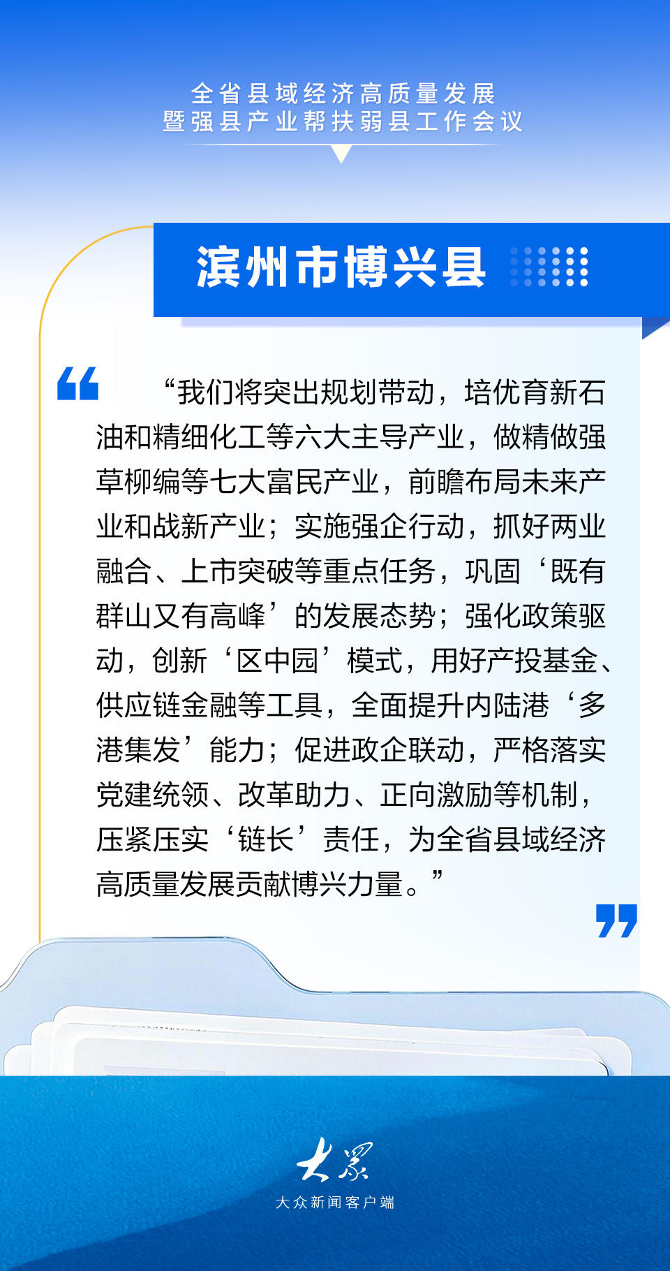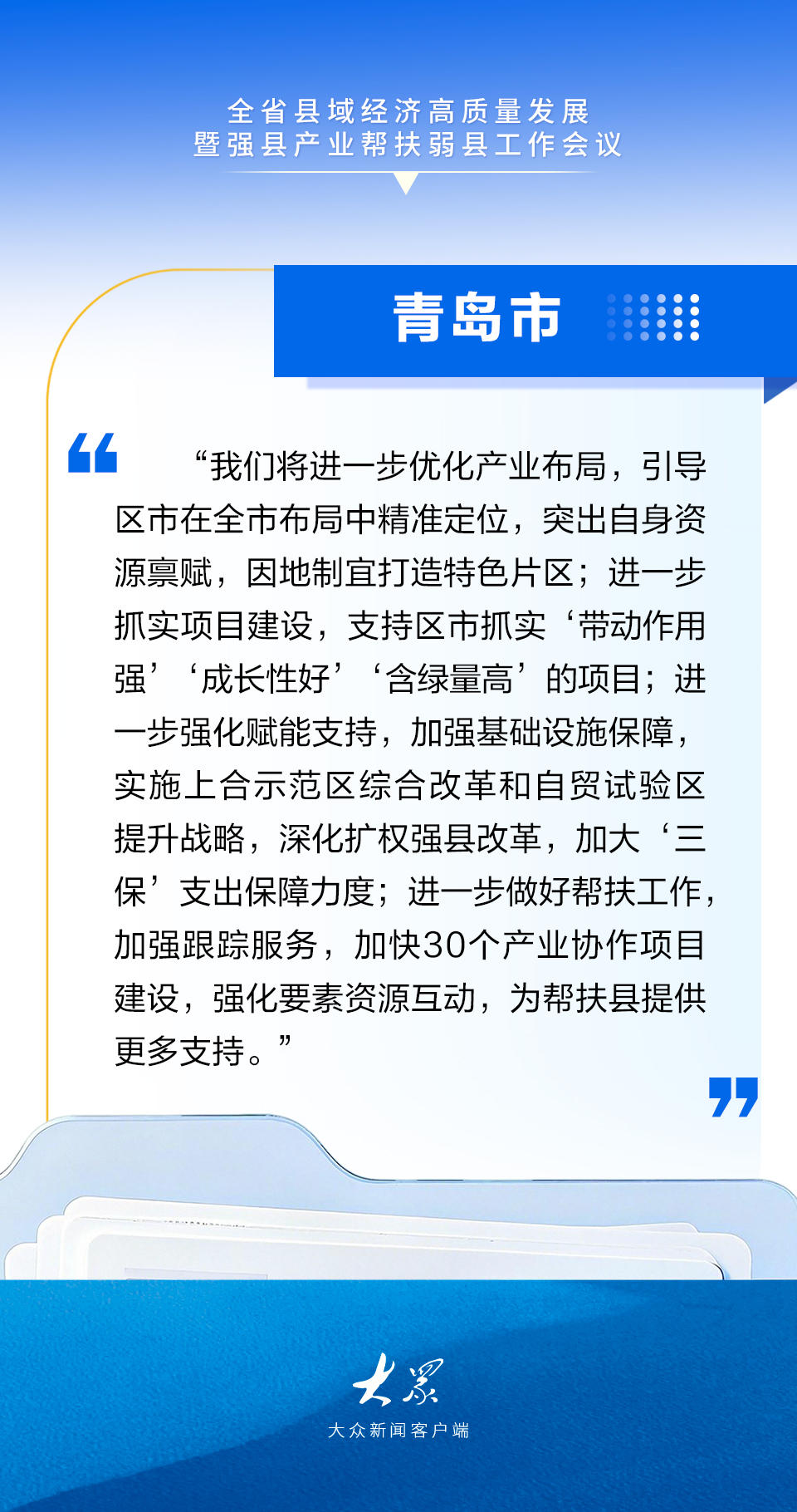4月27日上午,山东召开全省县域经济高质量发展暨强县产业帮扶弱县工作会议。会上,省委组织部、省发展改革委、青岛市、潍坊市、济南市历城区、滨州市博兴县、枣庄市台儿庄区作了交流发言。